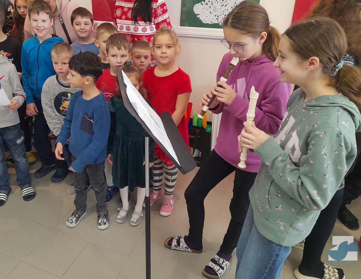 Ve školní galerii se rozezněla živá hudba a zpěv žáků.