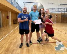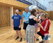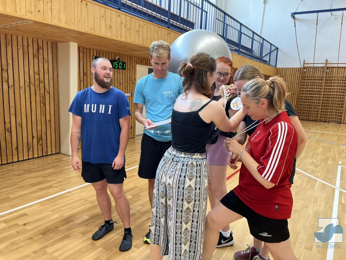 Naši učitelé dnes "ukončili" školní rok napínavým zápasem ve hře zvané Všechnoball, která se hraje přes síť s gymnastickým míčem. Hlavními hvězdami tohoto turnaje byli naši tělocvikáři, Mirka a Zdeňa, kteří vedli své týmy jako kapitáni.
