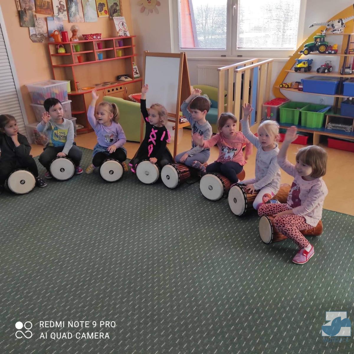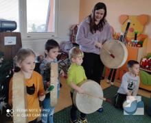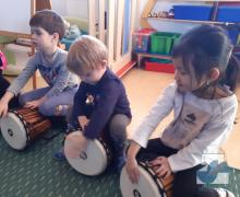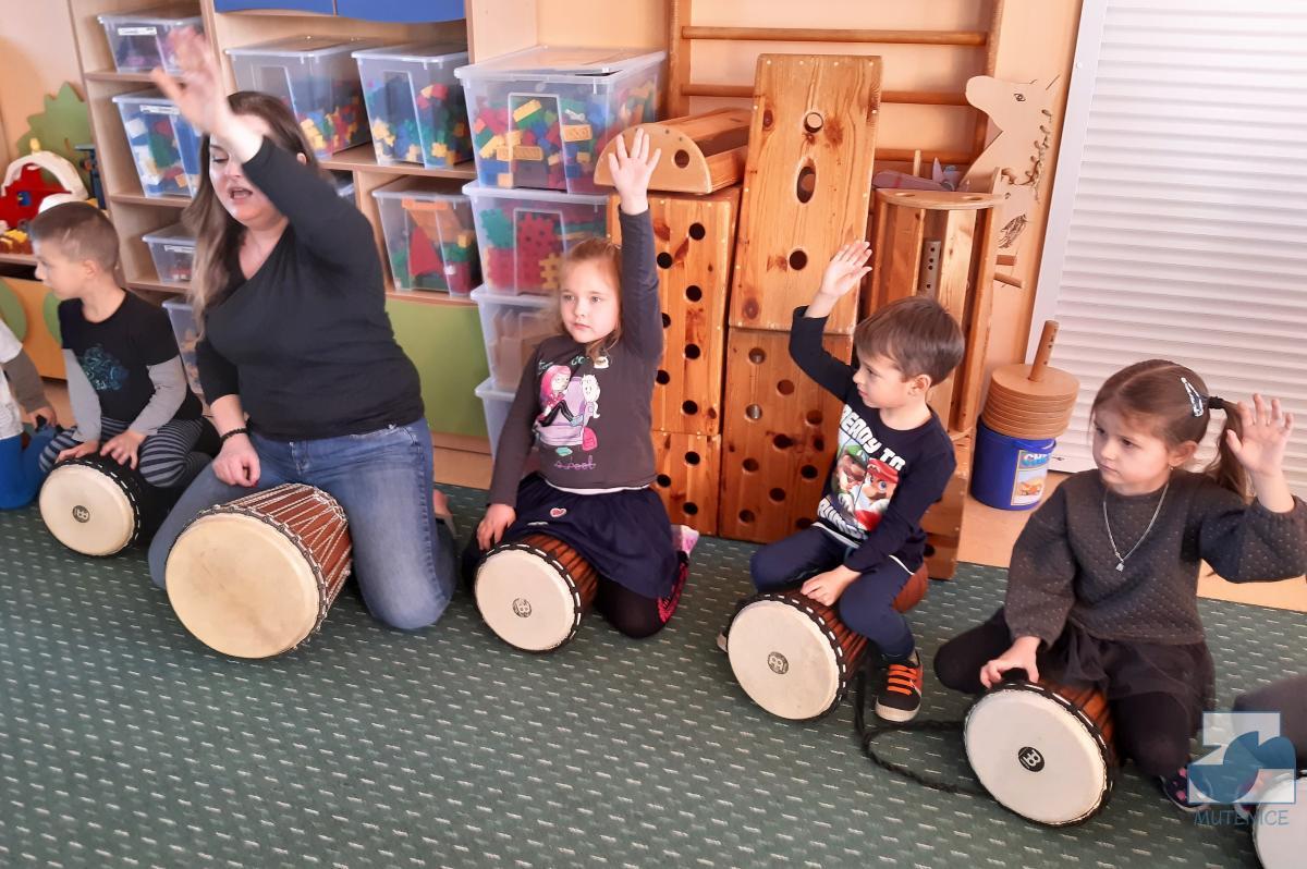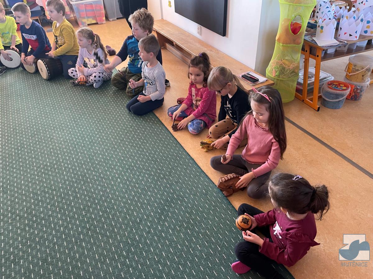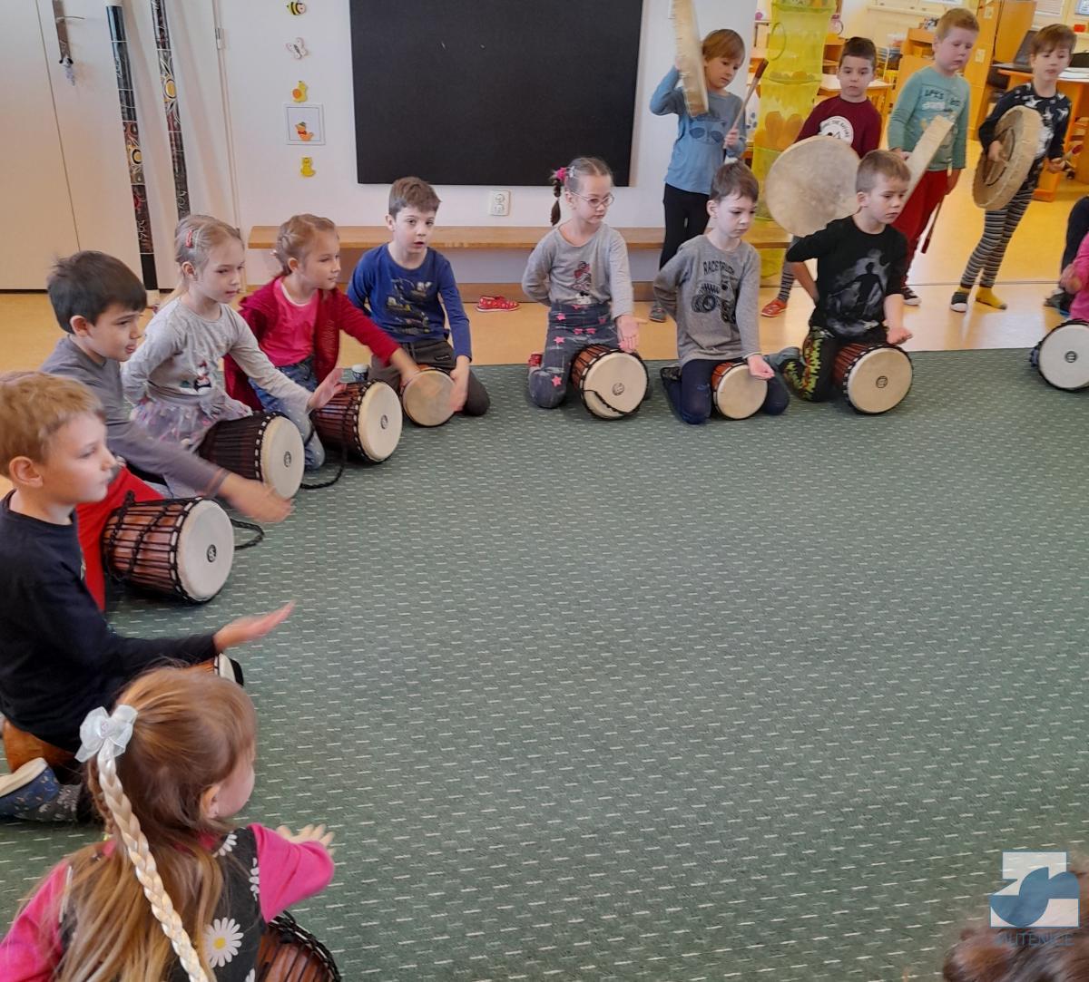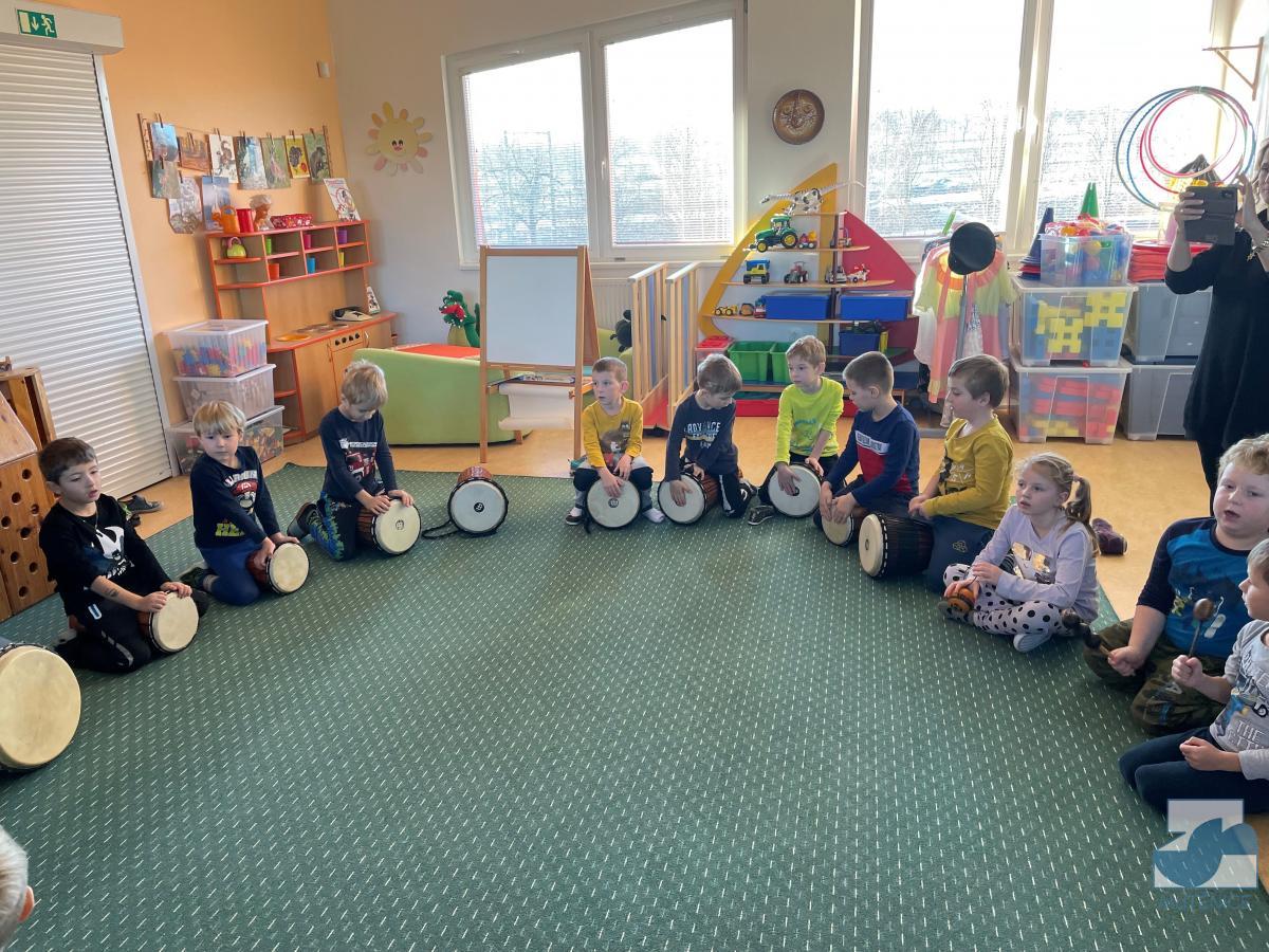 V pátek 7. 1. 2022 nás v mateřské škole navštívila Mgr. Alena Vlková a uvedla děti do skupinové muzikoterapie. Instrumentální hudební nástroje jako africké bubny Djembe, šamanské bubny, ozvučná dřívka, ozvučné žáby či dešťové hole navedly děti k přirozenému pohybovému projevu.