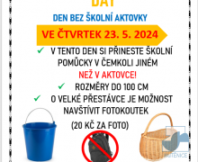 Dne 24. května se na naší škole konala zábavná akce pod názvem ,,NO BACKPACK DAY - Den bez aktovek", kterou organizovala Škollinka. Žáci si tento den užili naplno, protože místo tradičních aktovek a batohů si přinesli učební pomůcky v různých netradičních předmětech. Kreativita neměla hranice – děti přicházely s košíčky, kufry, vozíčky, motorkářskou helmu a dokonce i s malými ledničkami a přepravkami.