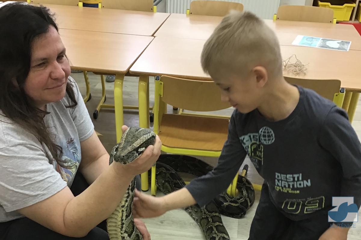Jedna z posledních hodin chovatelského kroužku patřila překvapení, vedoucí kroužku k nám tentokrát přijeli v doprovodu dvou velkých zvířat. Přivezli krásného ovčáckého psa a ve velké bedně zabalené v povlaku od peřiny čekalo děti překvapení - had opravdu velkých rozměrů Kája. A tak jsme se seznámili s krajtou tmavou. O obou zvířatech se děti dozvěděly mnoho zajímavého a jako obvykle nechyběl ani osobní kontakt s oběma návštěvníky.