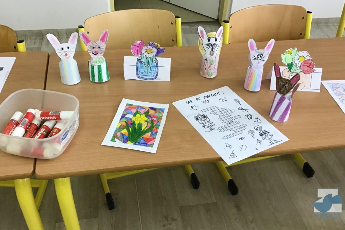 Velikonoční prázdniny trávily některé děti ze ŠD na společné dopolední akci. Počasí nám moc nepřálo, tak jsme se pustili do výtvarného tvoření. Děti si vyráběly velikonoční zajíčky a jarní vitrážové obrázky. Nechybělo ani několik pohybových her, hádankářská soutěž a krátká vycházka do okolí školy.