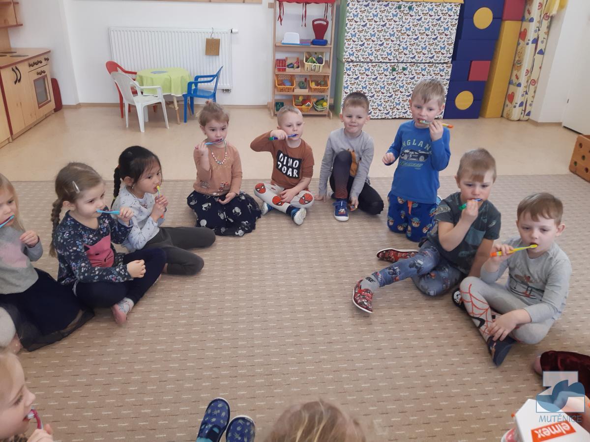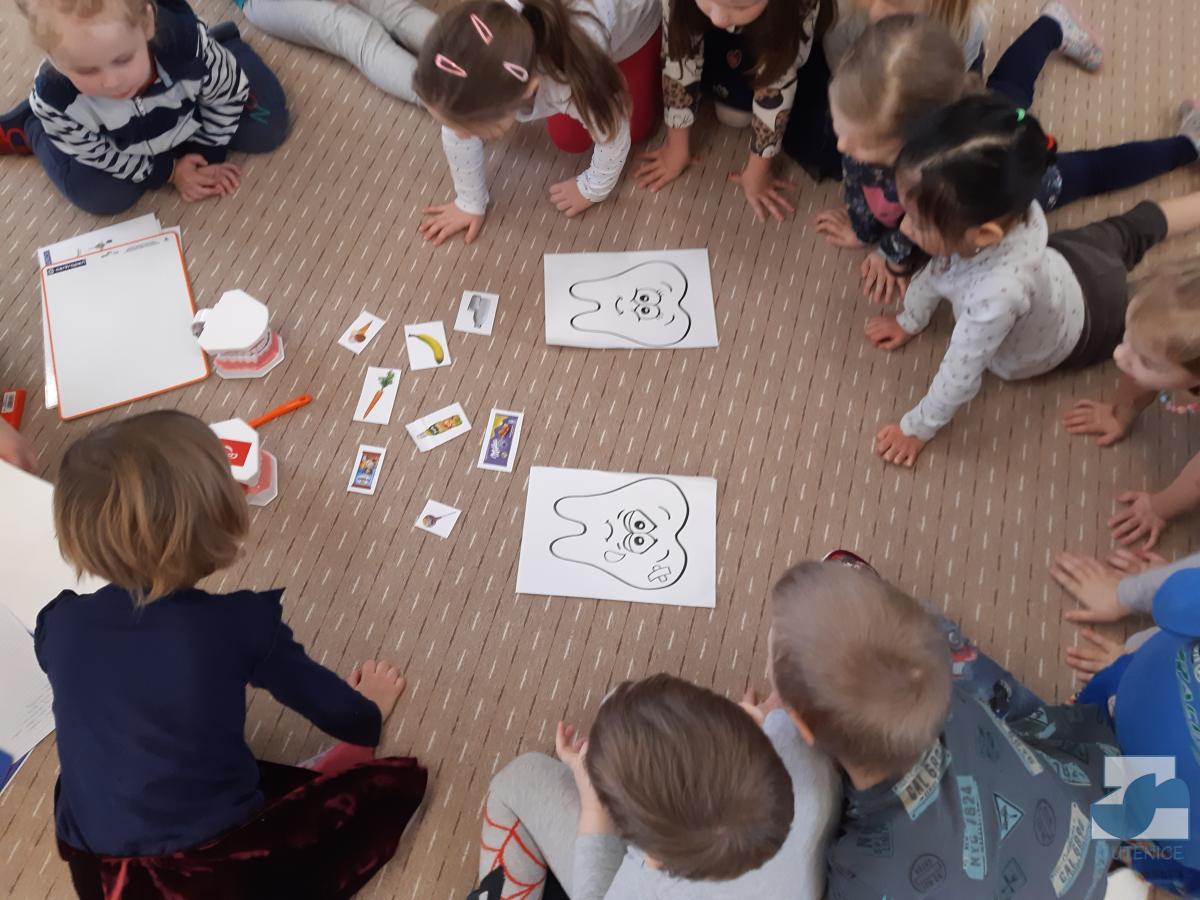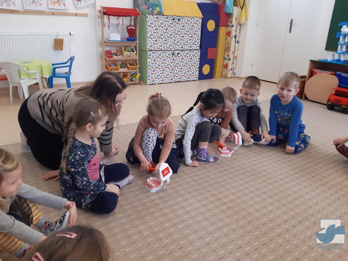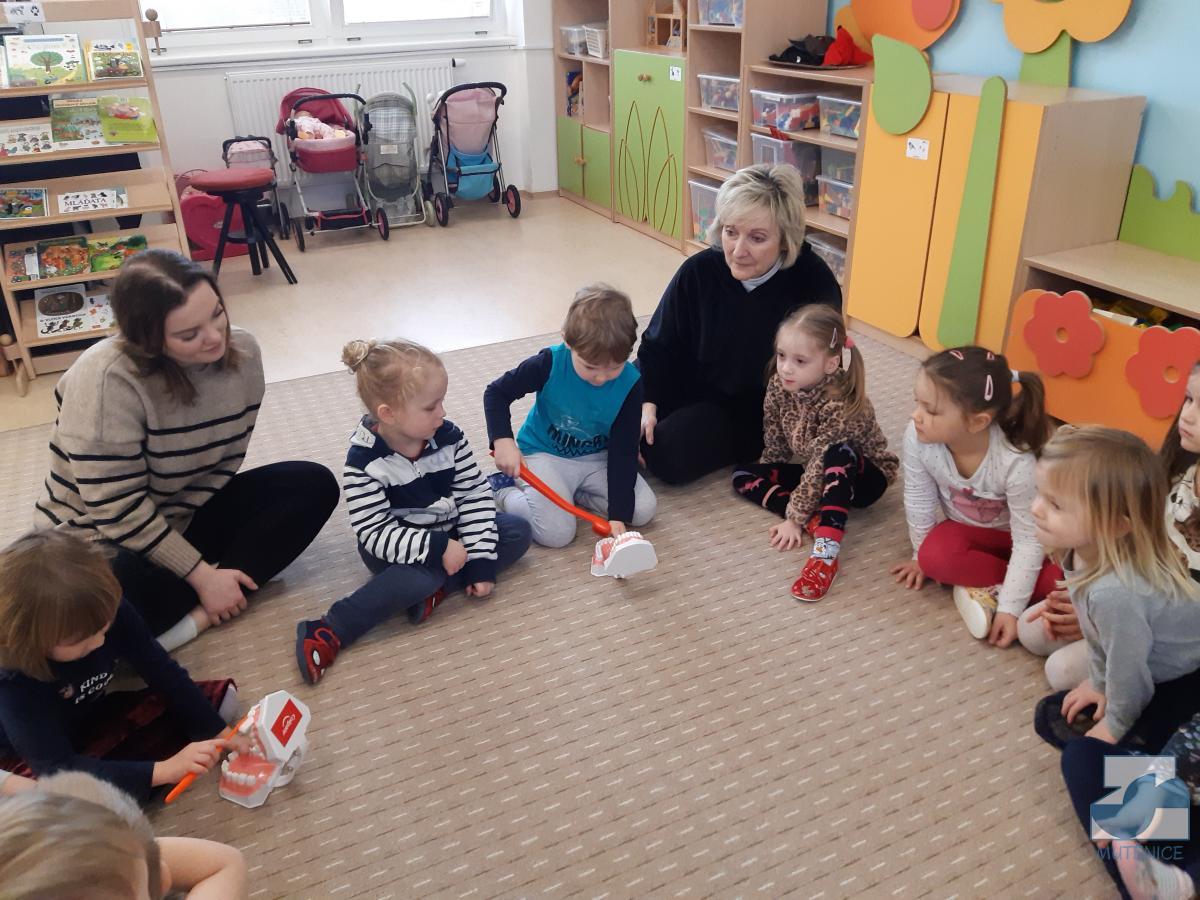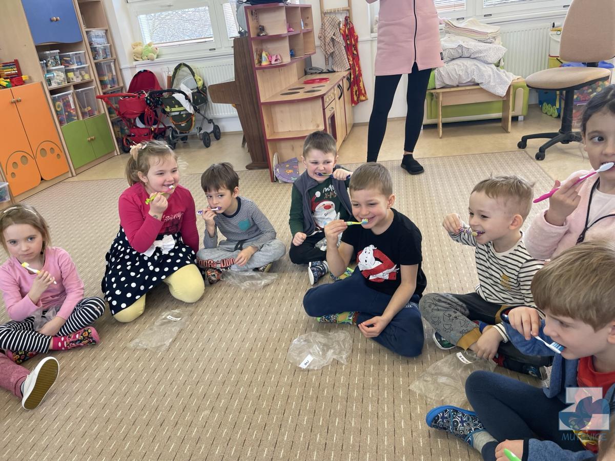 V pondělí 13. února a v pátek 17. února přijela do mateřské školy dentální hygienička, slečna Gabriela Marečková, která se zabývá zubní prevencí pro děti. Do programu se nejdříve zapojily děti ze tříd Kuřátek, Berušek a přípravné třídy ZŠ a následně děti ze Sluníček, Motýlků a Medvídků. Dětem byly zakoupeny nové zubní kartáčky, aby si přímo vyzkoušely, jak správně čistit zoubky, co zubům prospívá a co ne. Lektorka své poutavé vyprávění s ukázkami a pomůckami přizpůsobovala situaci a věkovým zvláštnostem dětí.