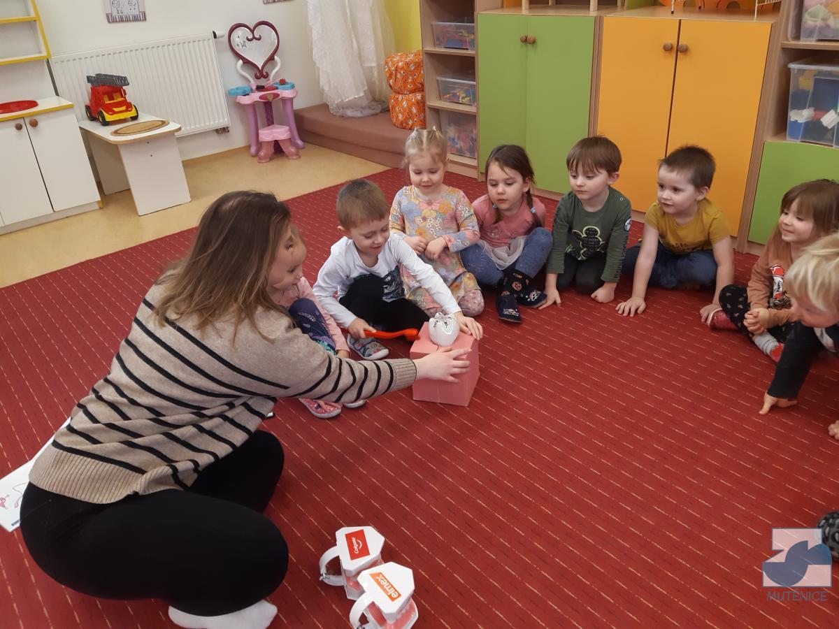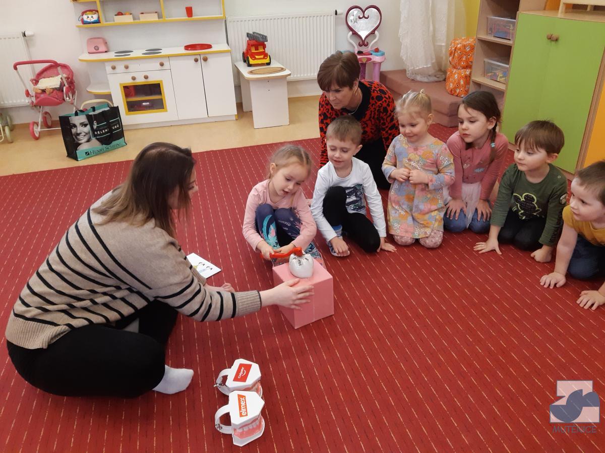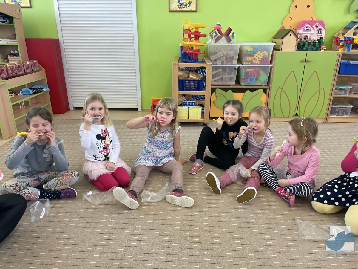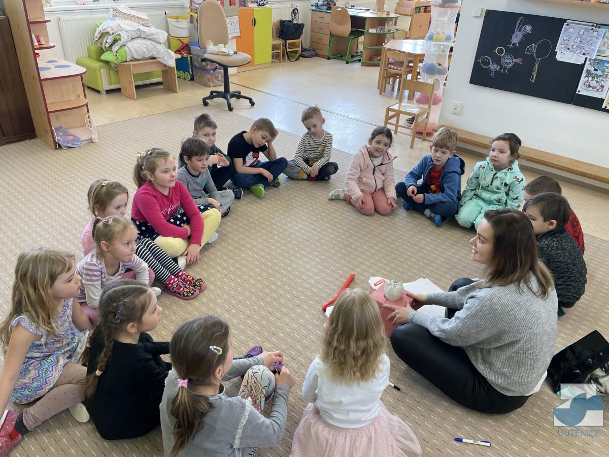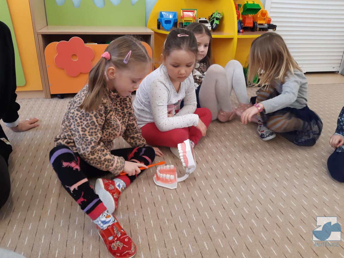 V pondělí 13. února a v pátek 17. února přijela do mateřské školy dentální hygienička, slečna Gabriela Marečková, která se zabývá zubní prevencí pro děti. Do programu se nejdříve zapojily děti ze tříd Kuřátek, Berušek a přípravné třídy ZŠ a následně děti ze Sluníček, Motýlků a Medvídků. Dětem byly zakoupeny nové zubní kartáčky, aby si přímo vyzkoušely, jak správně čistit zoubky, co zubům prospívá a co ne. Lektorka své poutavé vyprávění s ukázkami a pomůckami přizpůsobovala situaci a věkovým zvláštnostem dětí.